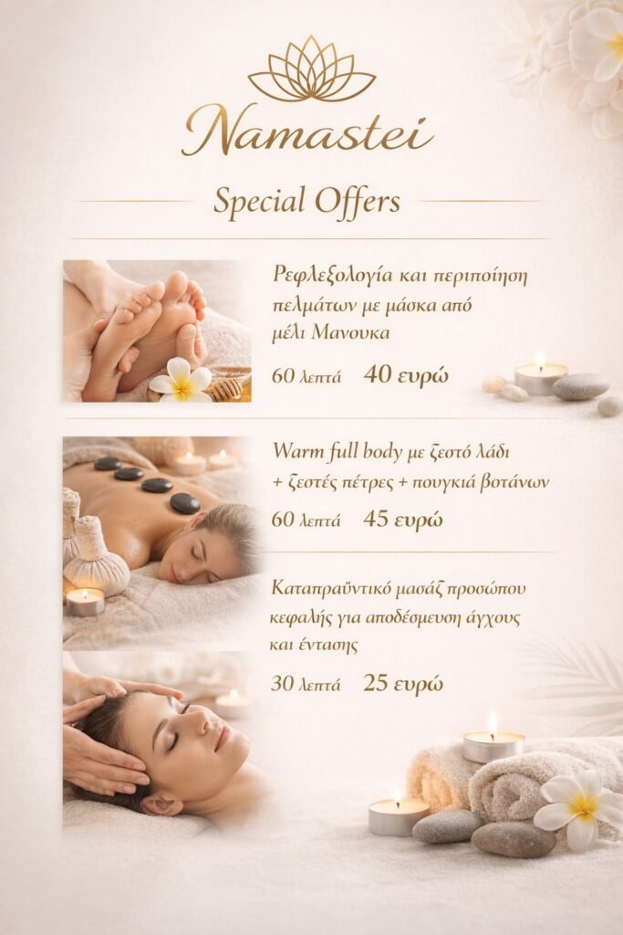 Μπείτε στον ιερό σας χώρο ανανέωσης. Δώστε προτεραιότητα στην ευεξία σας με εξατομικευμένη φροντίδα προσαρμοσμένη στο μοναδικό σας ταξίδι, είτε αναζητάτε πνευματική ευθυγράμμιση, σωματική ζωντάνια είτε αναζωογονητικό άγγιγμα.